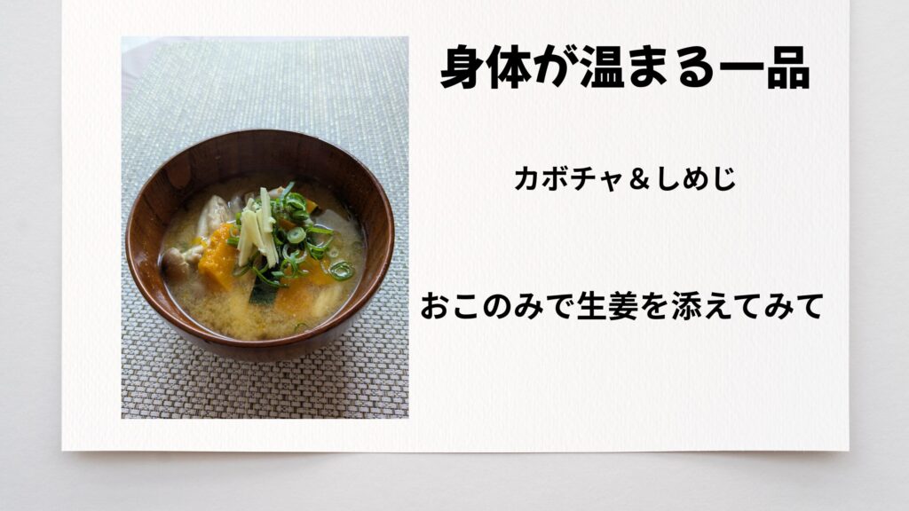 カボチャは胃腸のはたらきを高めて気を補う食材なので、疲労回復効果が高いです! 味噌汁だけでなくいろんなお料理に使える野菜です。寒い季節に身体を温めてくれます。